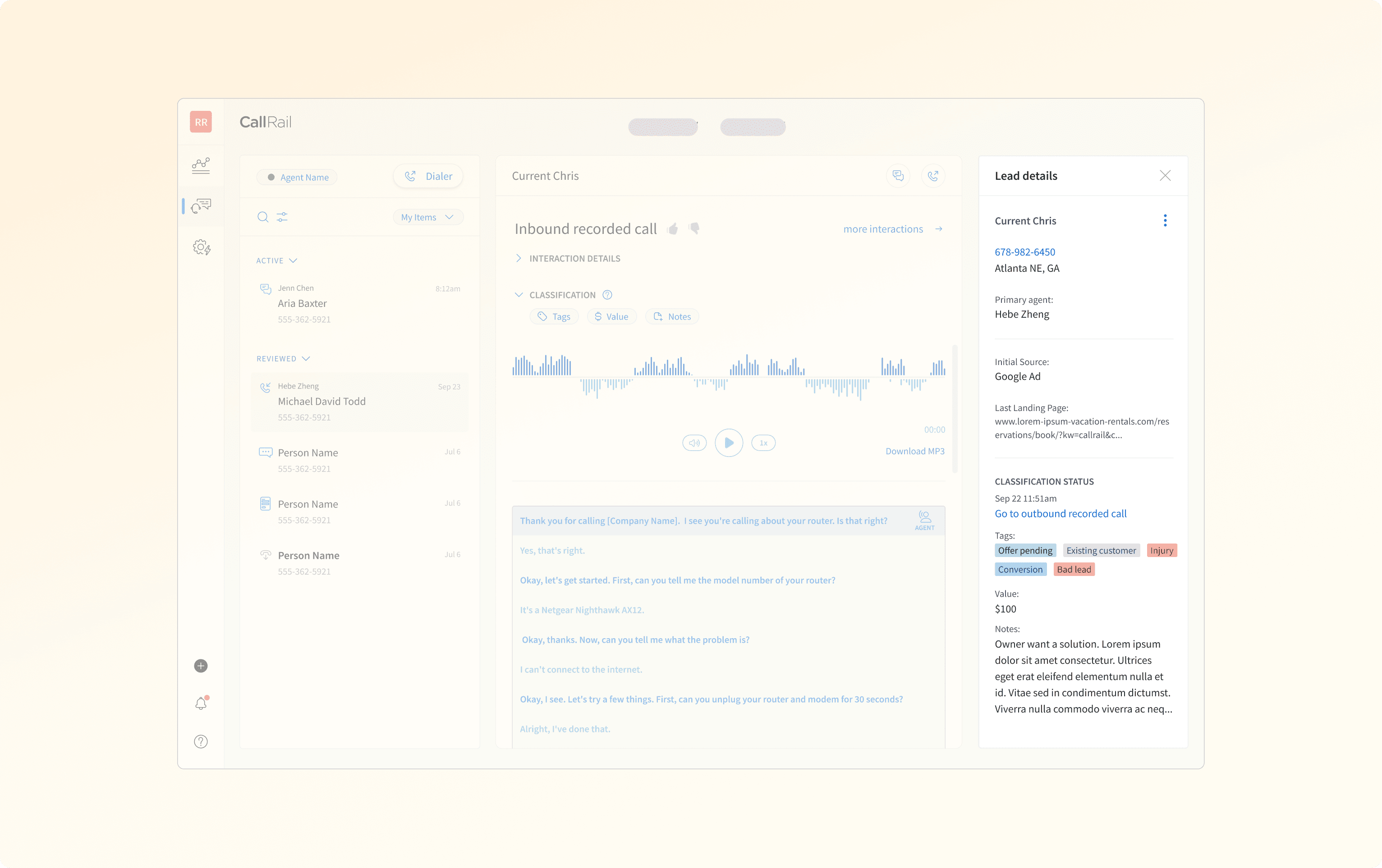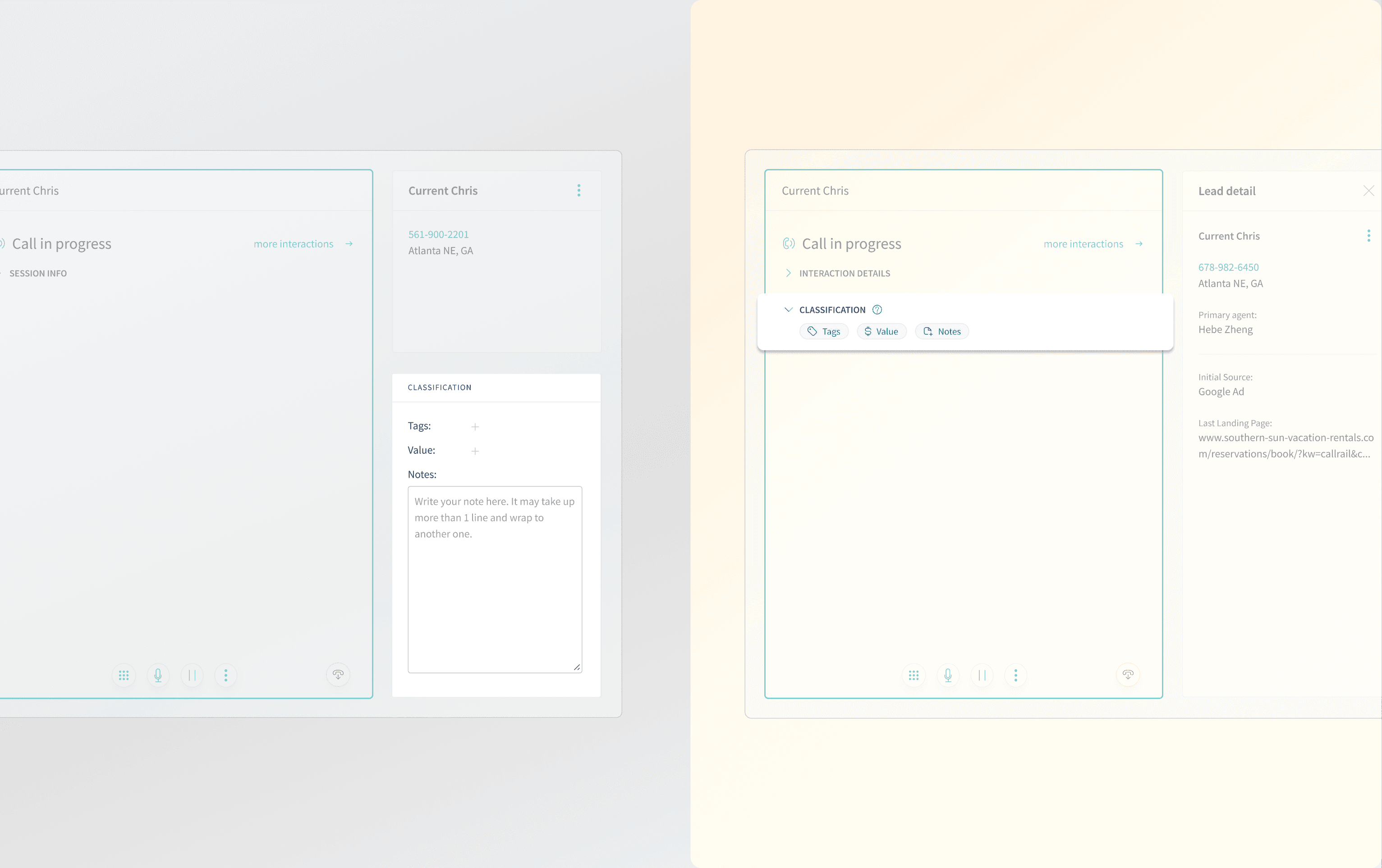 The supporting panel that classification vacated became something more useful: a context surface. When a caller rang back, agents could see the most recent tag, value, and notes from the previous interaction without leaving the call.